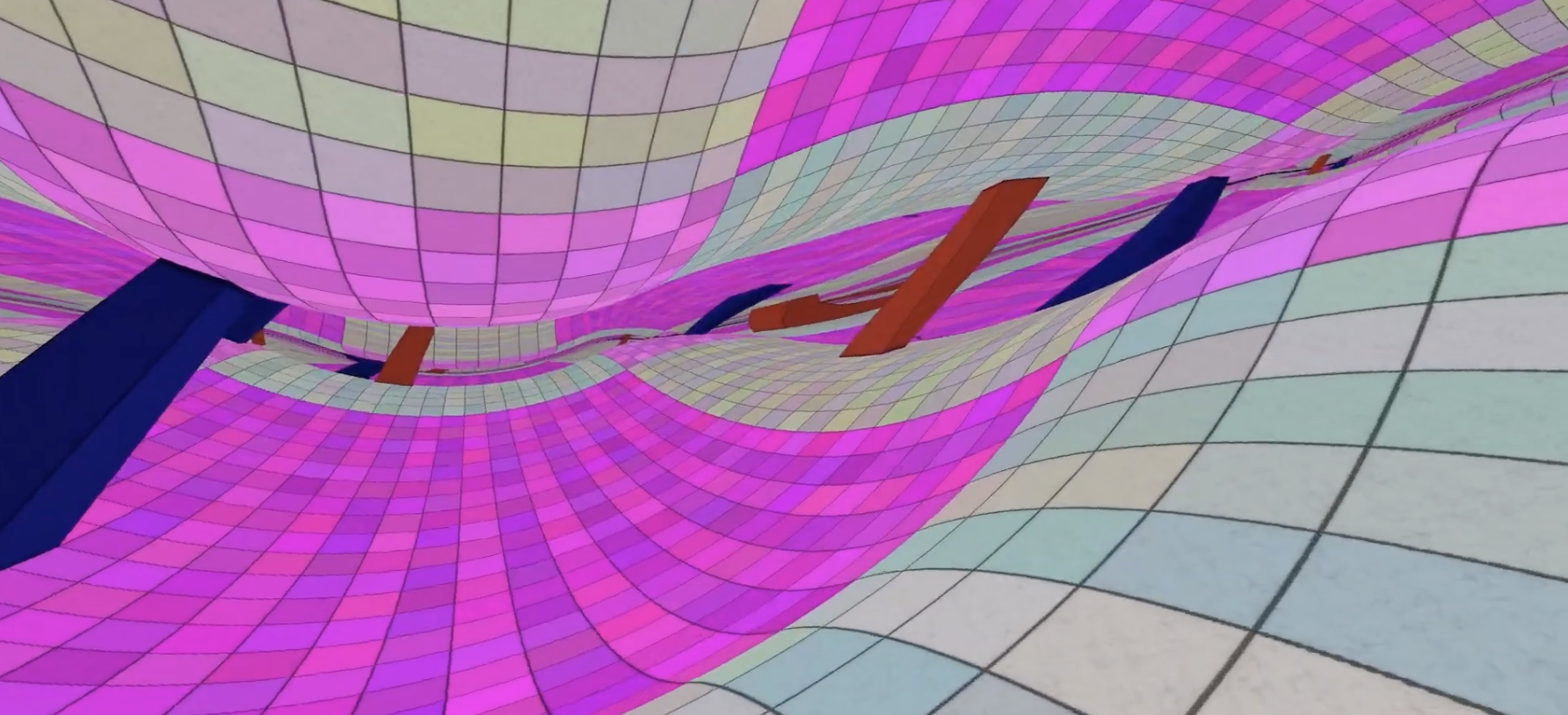 In this video the relevant section shows this infinite tiling where 3-manifolds with different geometries are glued together in an alternating pattern: