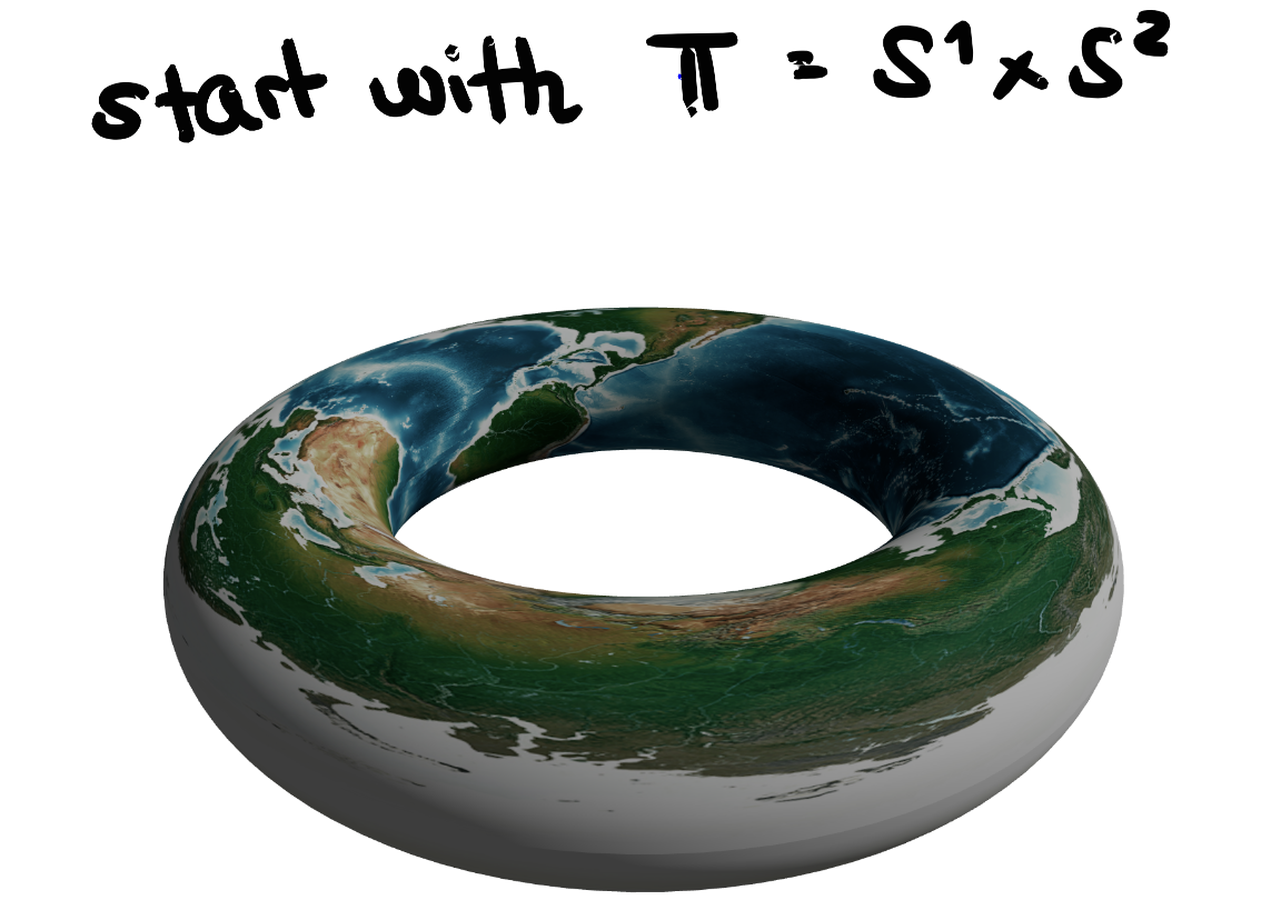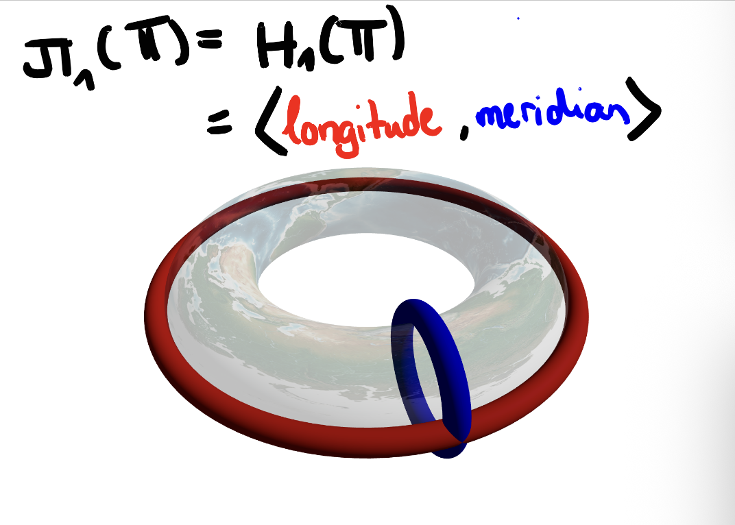 What could cause \(\pi_1(\iota)\) to fail at being injective? By the Hurewicz theorem, the first homology group \(H_1(S)\) is the abelianization of \(\pi_1(S)\), but for \(S\) a torus, \(\pi_1(S) = \mathbb{Z}^2\) is already abelian, so \(H_1(S) = \pi_1(S)\). \(H_1(S)\) is generated by the longitude and the meridian of the torus, so if either of those is sent to zero by \(\pi_1\), then \(\pi_1(\iota)\) cannot be injective.