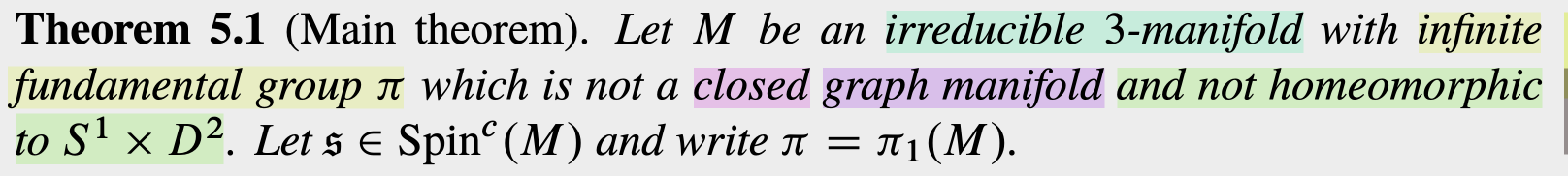 Aka. \(\|\pi_1(M)\| = \infty\). We use this to apply the famous Thurston geometrization theorem (these slides are from Lücks “Introduction to 3-manifolds” talk in Bonn):