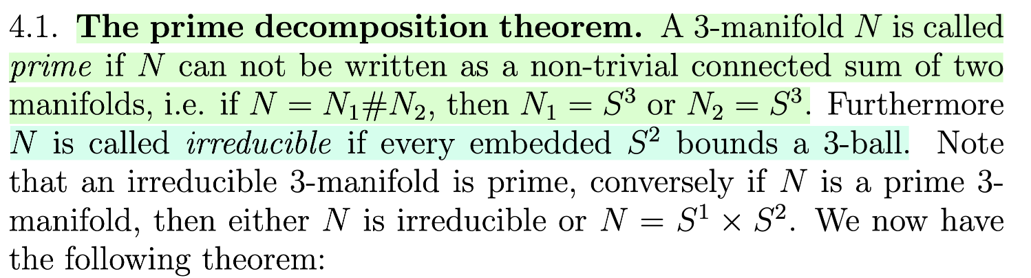 So being irreducible means either of the following equivalent conditions hold: - every embedded \(S^2\) of \(M\) bounds a \(D^3\). - \(M\) is prime (\(M = N_1\# N_2 \implies N_1 = S^3 \text{ or } N_2 = S^3\)) or \(M = S^1 \times S^2\).